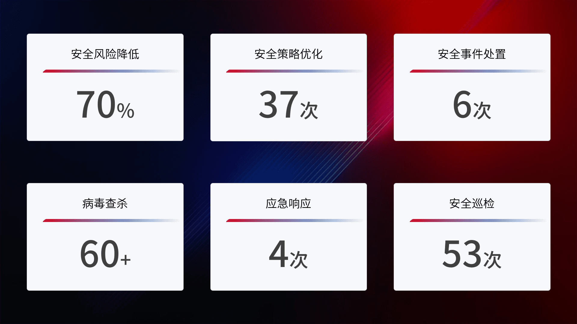 提供全面的安全事件报告体系,,,,包括处置报告、、周报、、、季度和年度总结,,结合持续监控,,,,帮助客户深入了解网络安全状况。。。