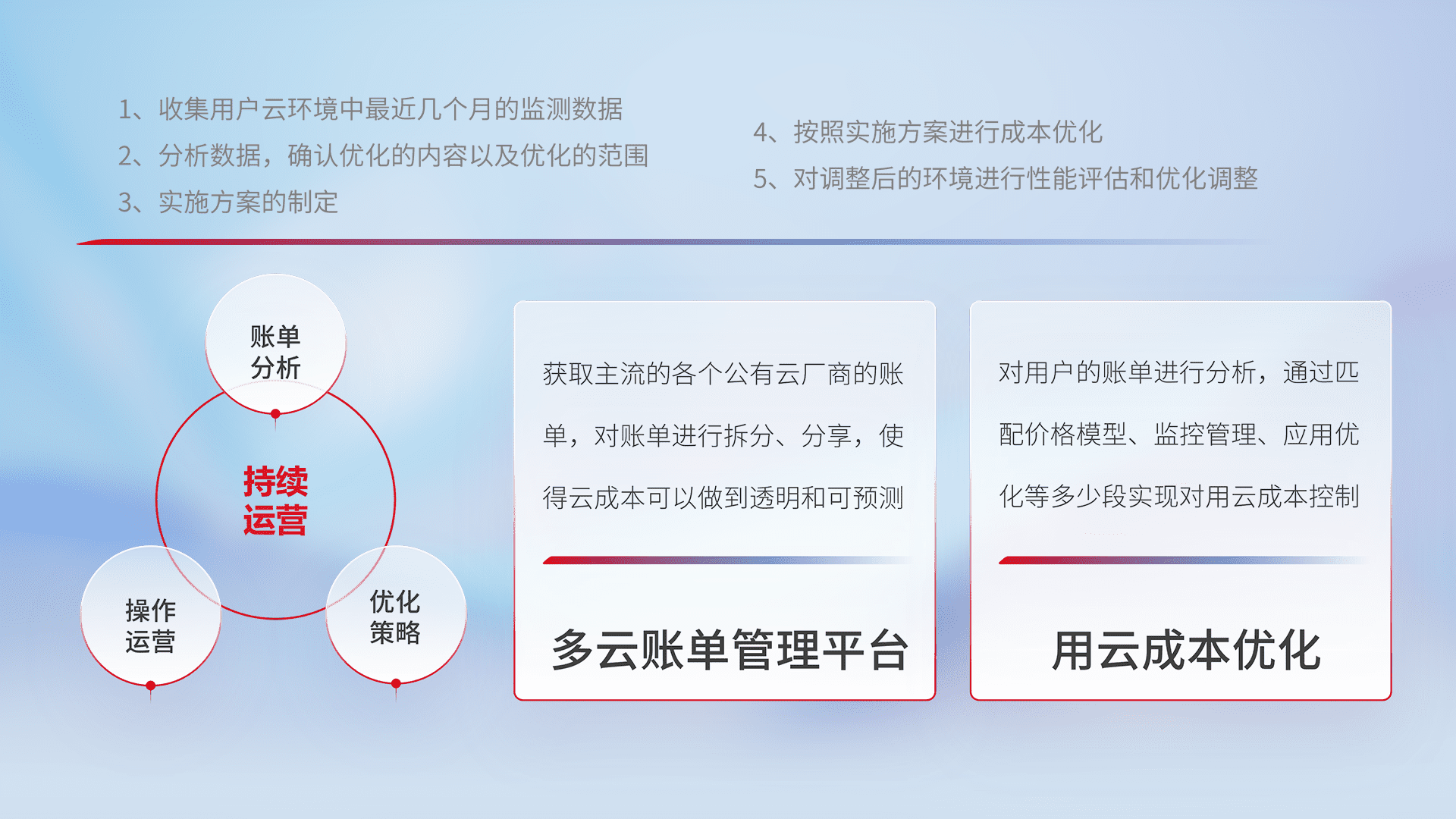 通过多云纳管,,以统一的资源数据模型把客户的云资源进行抽象和封装,,,进而实现对多云资源的统一操作,,,保障云资源管理的可靠性、、稳定性与可用性。。。。量身定制化运维内容,,配置、、开发运维、、补丁管理、、、、备份、、监控、、、、认证和访问管理、、、审计和日常巡检等,,,保障在用云过程中的可靠度,,,,稳定度以及高可用率。。。